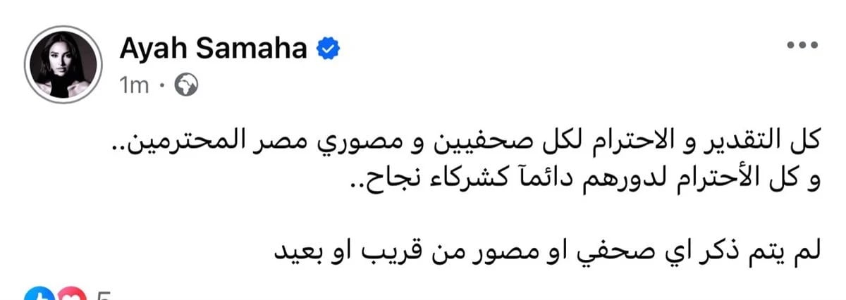 وكتبت آية، عبر حسابها الشخصي في موقع التواصل الاجتماعي “فيسبوك” منشوراً قالت فيه: “كل التقدير والاحترام لكل صحافيي ومصوّري مصر المحترمين… وكل الاحترام لدورهم دائماً كشركاء نجاح، لم يتم ذكر أي صحافي أو مصوّر من قريب أو بعيد”.
